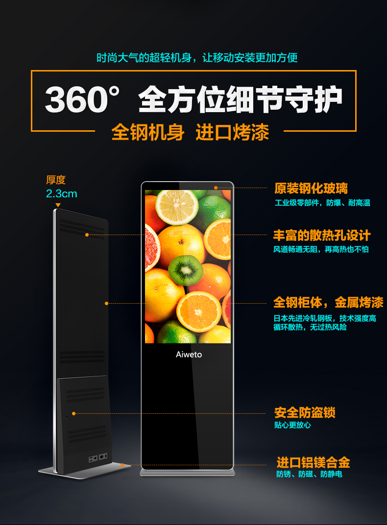 AW-CM320L01 立式觸摸一體機(jī)采用全高清(1920*1080)液晶面板,具有178度視角,高對(duì)比度和亮度,3D數(shù)字降噪,智能消除殘影、重影等失真現(xiàn)象,使得顯示畫面更清晰,穩(wěn)定,色彩更鮮艷。可廣泛運(yùn)用于快餐店、訂票處、學(xué)校、機(jī)場(chǎng)、酒店大堂、交易所、電影院、企業(yè)、會(huì)展展館、商場(chǎng)等場(chǎng)所。