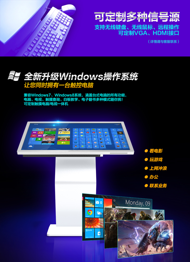 ※ 產(chǎn)品備注:可選windows系統(tǒng)或者安卓系統(tǒng),備貨顏色:銀色、白色,其他顏色可訂做,備貨尺寸:32寸、43寸、49寸、55寸、65寸,其他尺寸可訂做;