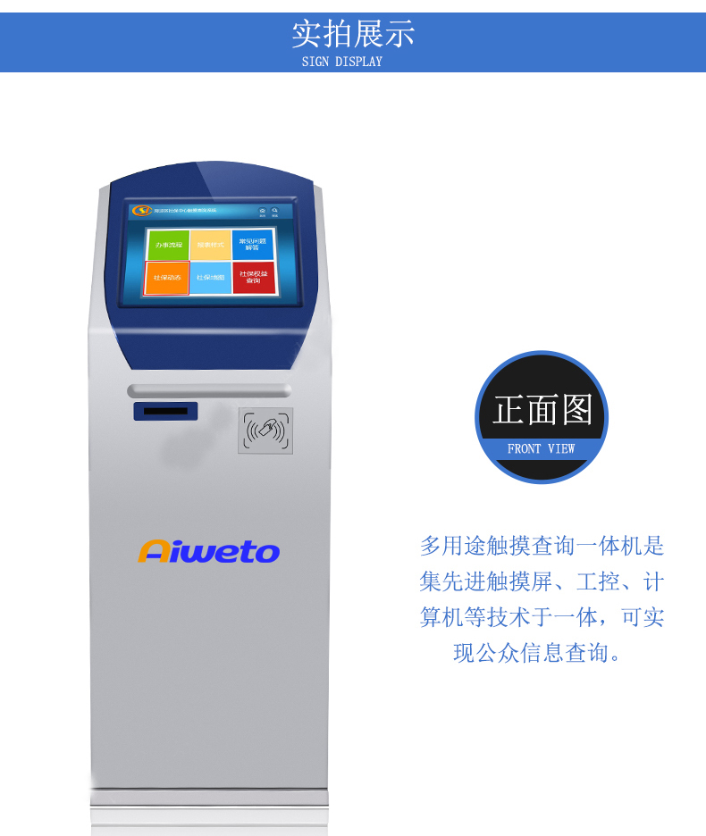 觸摸屏查詢一體機(jī)是一款智能觸摸查詢設(shè)備。它集觸控、液晶顯示、電腦主機(jī)于一體,可用于觸控互動(dòng)、查詢信息多媒體教學(xué)等。觸摸一體機(jī)主體由流暢的直線構(gòu)成,簡約,時(shí)尚,符合現(xiàn)代社會(huì)流行趨勢。整體造型設(shè)計(jì)利于人體機(jī)學(xué)設(shè)計(jì),使用戶擁有更舒適、更便捷、 更貼心的視覺觸覺雙重體驗(yàn)。