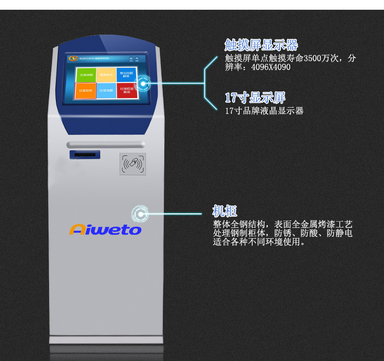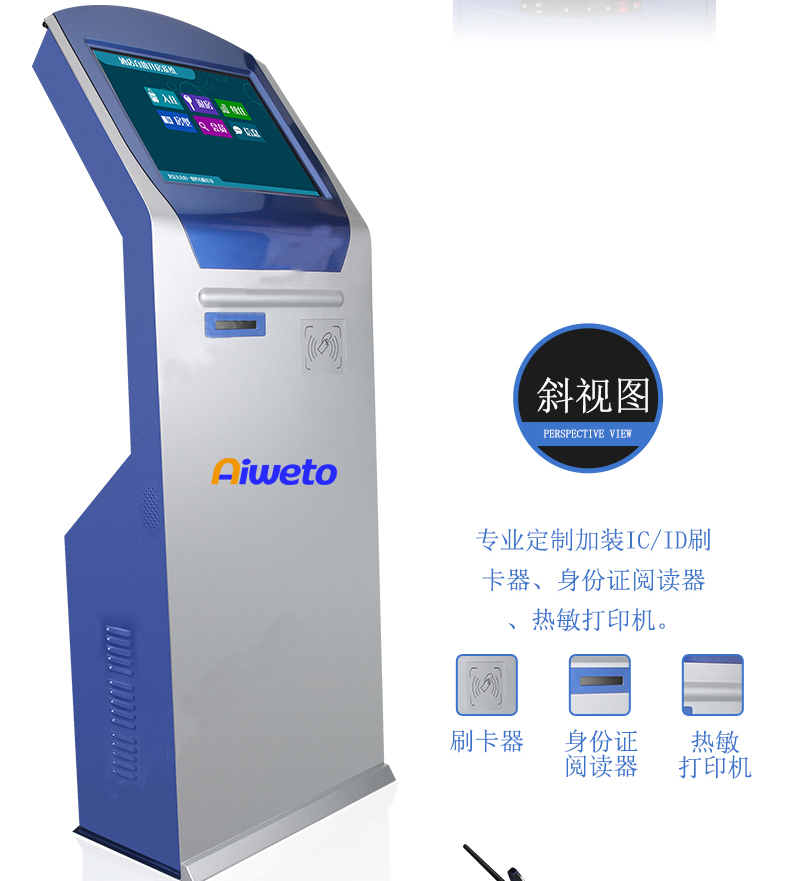 17”19”排隊(duì)叫號機(jī),排隊(duì)取號系統(tǒng)軟硬件皆可定制,多種組件可選擇:附帶功能可調(diào)換,可智能讀取二代身份證支持紅外掃描,條形碼、LED顯示屏,鍵盤,更換色板等高端配置,極速體驗(yàn)。