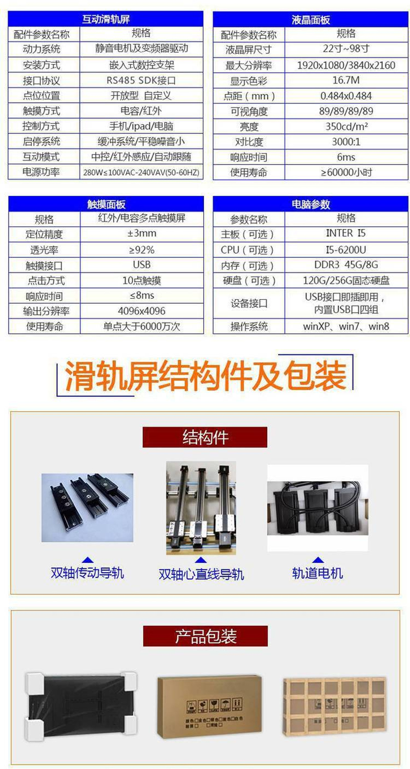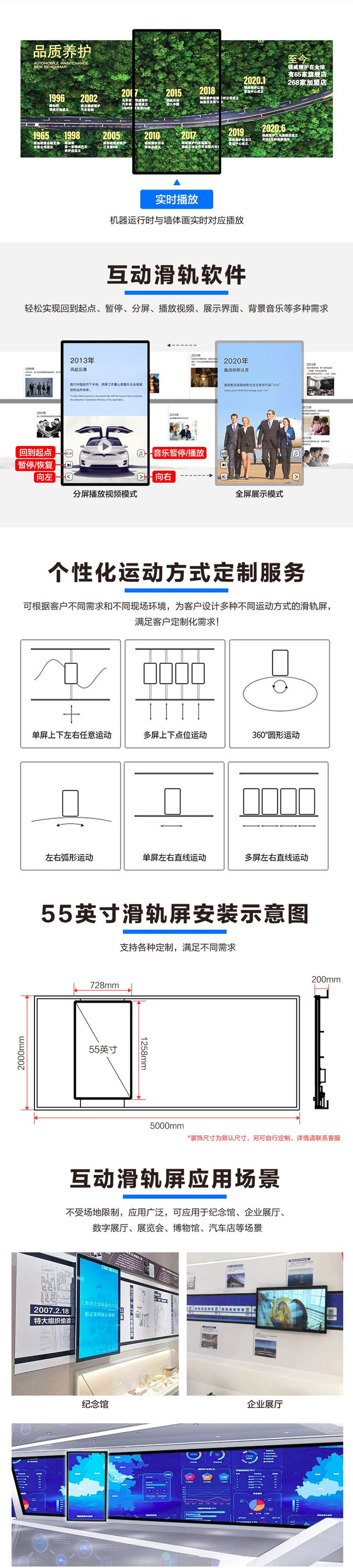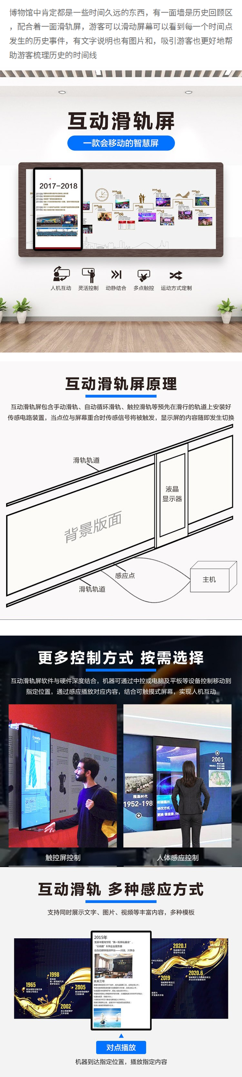 常規(guī)的觸摸互動和體感互動屢見不鮮,滑軌系統(tǒng)升級互動模式,新增電動機械互動形式,體現(xiàn)智能科技制造,是一種全新的互動體驗模式。電動滑軌,是滑軌互動系統(tǒng)的全新升級,又稱為滑軌電視,簡言之是可以在軌道上滑行的顯示屏。通過機械滑軌控制裝置,結合高清液晶顯示幕墻,實現(xiàn)對屏幕內(nèi)容的互動控制:在展墻上安裝廣告板或者液晶屏作為背景幕墻,通過一組可滑動的機械軌道以懸掛液晶顯示屏,可在背景墻上設置多個感應點,當液晶顯示屏移動到每個感應點時即可自動播放對應內(nèi)容,內(nèi)容可支持圖片,文字,視頻等多種形式,可與觸摸同時使用,讓展示更具有科技感,智能化。